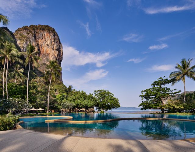 Das Rayavadee bietet einen herrlichen Pool, der einen Meerblick und eine beeindruckende Felsenlandschaft präsentiert.