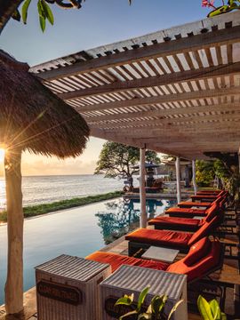 6. Belmond Jimbaran Puri (Bali): Das Herzstück des Belmond Jimbaran Puri auf der Insel Bali in Indonesien ist ein in blau-grünem Naturstein gehaltener Infinity-Pool, der aus Wasserkaskaden gespeist wird.